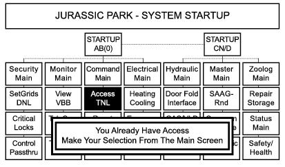 在房间四周,监视器迅速地显示出公园内各地区不同的画面。大部分是灰蒙蒙的影像,因为外面雾气弥漫,但是有一部监视器显示出旅馆的外部,屋顶上有一只恐龙,接着另一部监视器转到阳光明媚的画面,显示出一条船的船头,沐浴在灿烂的阳光下……